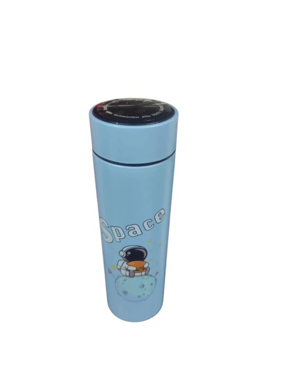 - DESIGN: Stylish blue thermos featuring a charming space-themed design with an astronaut sitting on a moon illustration